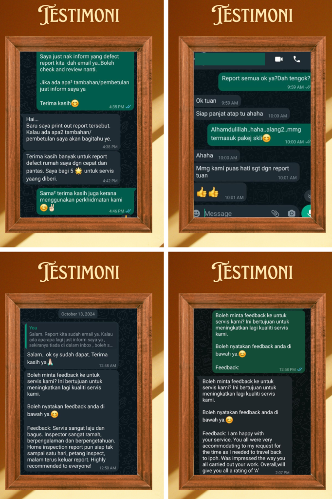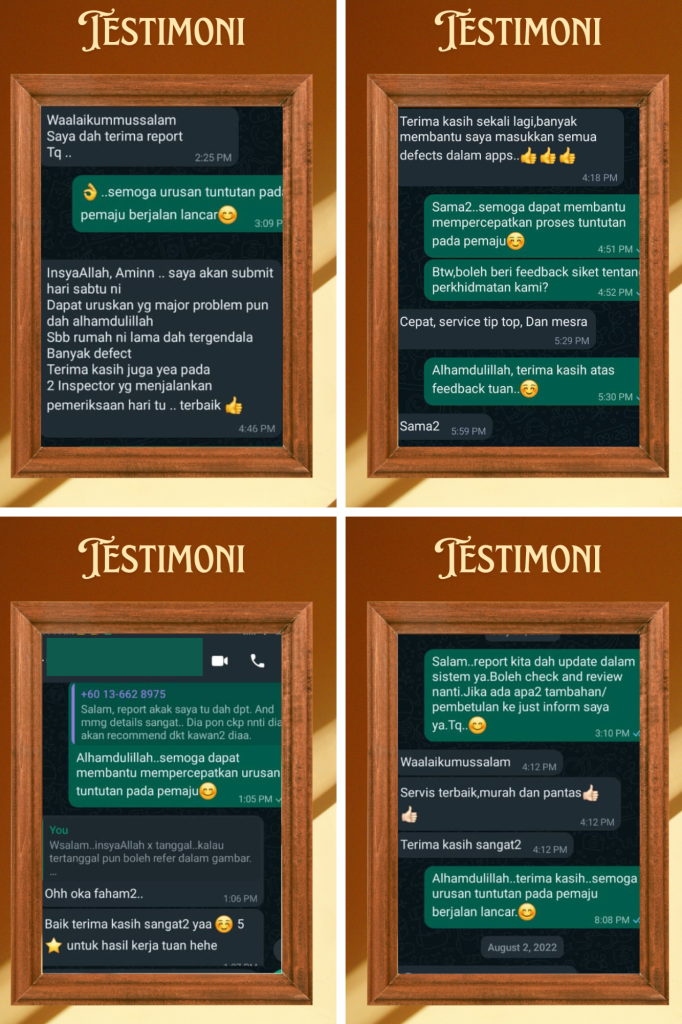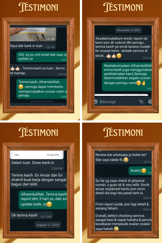Kami akan kumpulkan semua gambar dan maklumat defect dalam satu laporan berbentuk PDF dalam tempoh 24 JAM selepas inspection selesai.